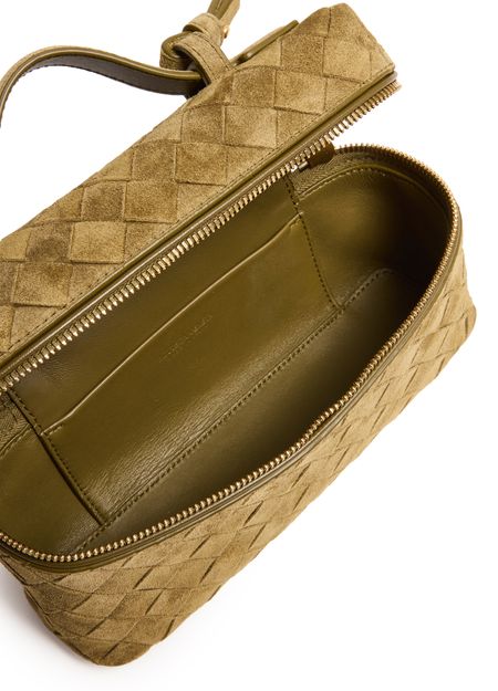 Reveal Bottega Veneta's Bang Bang vanity case, crafted in sumptuous suede with the iconic Intrecciato weaving technique. A single handle and thin, adjustable strap offer versatile carrying, while gold-finish hardware and a spacious, leather-lined compartment ensure both elegance and practicality for modern essentials.