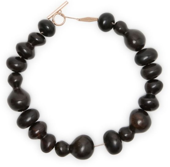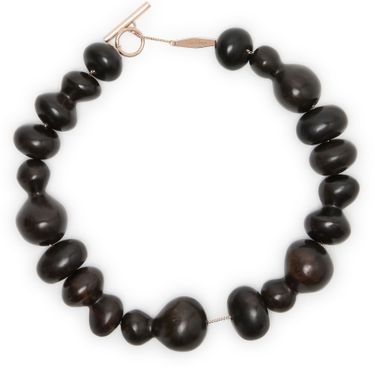 Reveal Max Mara's bead necklace, a modern statement featuring a beaded chain and a sleek T-bar closure. The engraved logo adds a refined touch, making this piece a standout accessory for any occasion. Elevate your look with this contemporary design that embodies effortless sophistication.