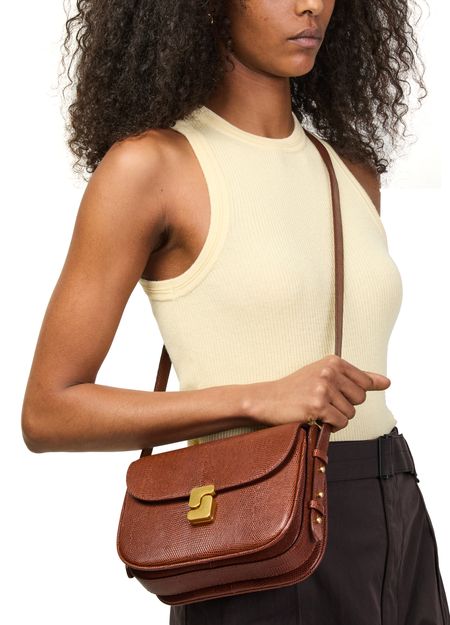 Reveal Soeur's Bellissima mini bag, a statement piece with a striking python pattern and gold finish. The adjustable thin strap and twist lock closure offer both style and versatility, while visible stitching highlights the refined craftsmanship. Perfect for elevating any modern ensemble.