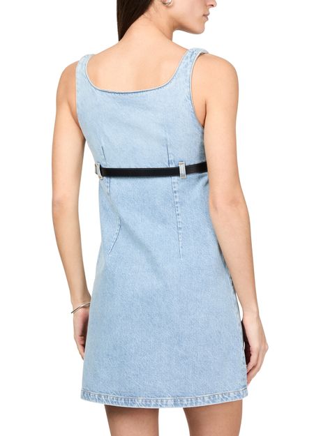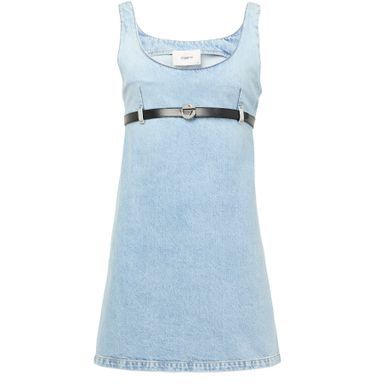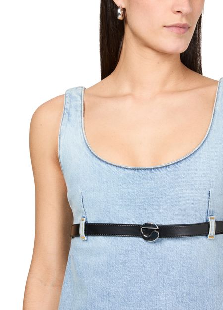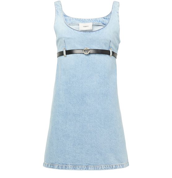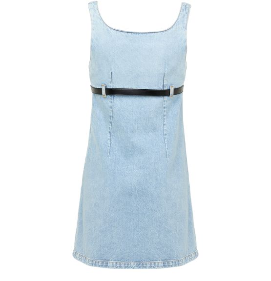 • Description : belt loops, visible stitching, mini dress, sleeveless, a-line cut, round neck, belted waist.