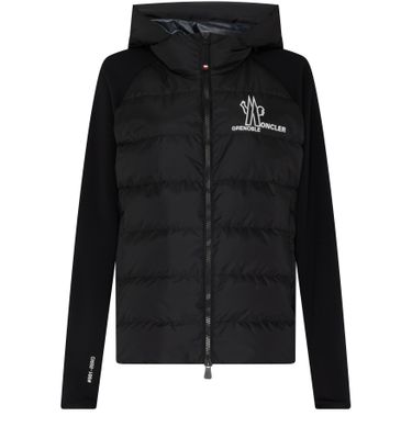 Moncler Grenoble's Bi-material down jacket showcases a stylish short design with long-sleeved comfort. Its zipper closure ensures a snug fit, while the hood adds extra warmth. Featuring a prominent chest logo and an appliquéd logo, this puffer jacket combines functionality with high-fashion flair, perfect for any winter adventure.
