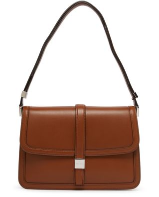 • Description : flap closure, single compartment, silver finish, leather handle, single handle, front logo, engraved logo, visible topstitching, hand carried, worn on the shoulder.