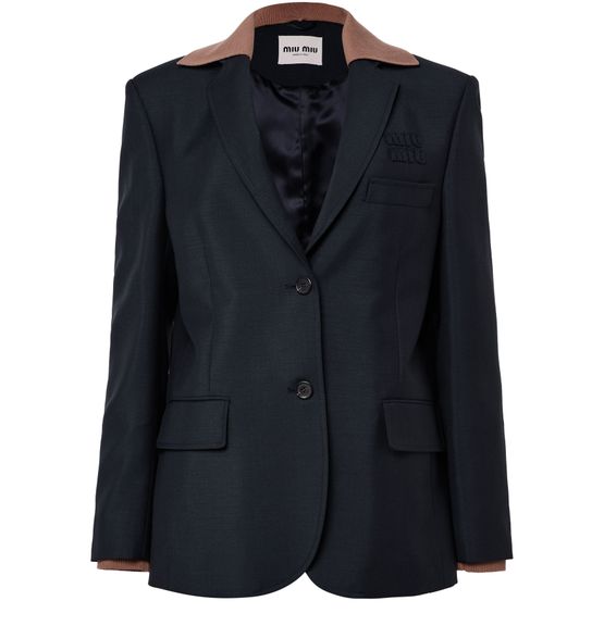 Reveal Miu Miu's blazer with knitted sleeves, a short silhouette featuring a refined collar and long sleeves. The chest logo and flap pockets add a modern touch, while the two-button closure ensures a tailored fit. Perfect for elevating both casual and formal looks with effortless sophistication.