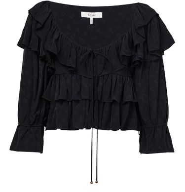 Chloé's Blouse showcases elegant ruffle details and a charming appliquéd logo, perfect for any occasion. Its regular length and three-quarter-sleeved design offer versatility, while the round neck adds a touch of sophistication. Visible stitching enhances its artisanal quality, making this blouse a timeless addition to your wardrobe.