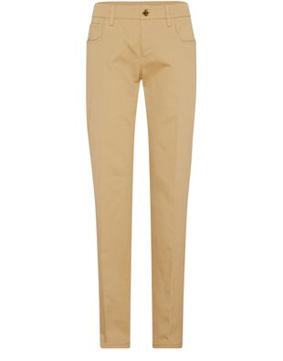 Miu Miu's Bootcut chino pants are casual ankle-length pants with a logo at the back label. They feature a buttoned and concealed zipper closure, back patch pocket, side pockets, five-pocket style, back darts, belt loops, visible stitching, high-waisted fit, and a straight cut for a stylish look.