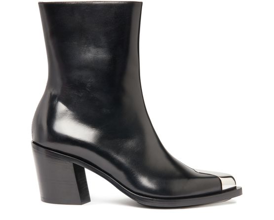 Alexander McQueen's high-top boots feature a pointed toe, visible stitching, and a block heel for a modern look. The side zipper and metal finishes add edgy detail to the design. Ideal for pairing with a variety of outfits, these boots offer a stylish and versatile option for any wardrobe.