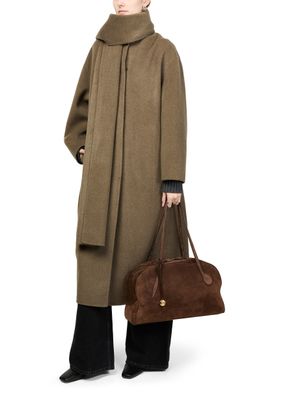 Introducing Liffner's bowling shoulder bag, a masterpiece in suede. This elegant piece features double handles and a spacious interior with a zippered pocket, all secured by a zipper closure. The visible topstitching and gold finish add a touch of sophistication, making it a must-have accessory.