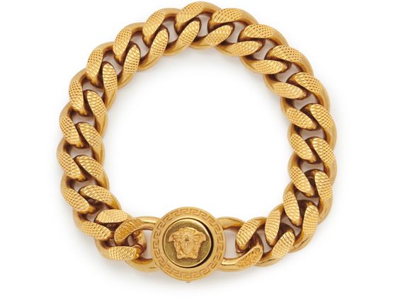 This Versace bracelet incorporates the designer's signature details. This creation for men features wide links and a textured Medusa pattern.