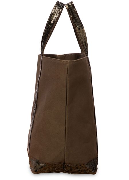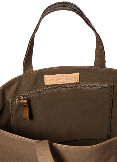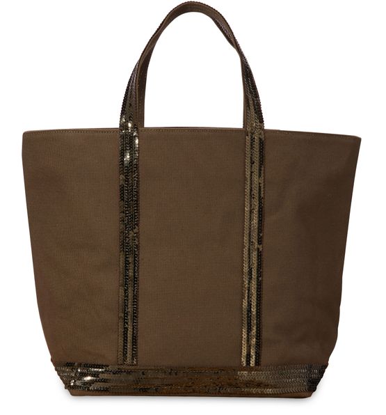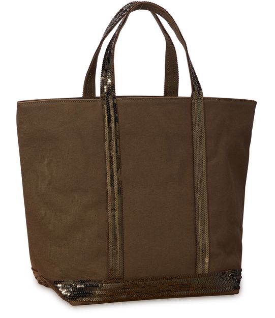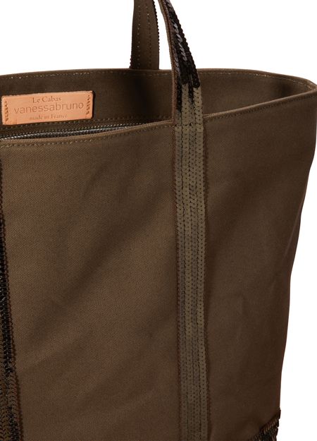 Cotton canvas cabas tote bag highly durable and waterproof, topped with sequins. This is the standard size for this model of tote bag and can be carried only at hand. It has an inside zipped pocket, which is topped off with a label of natural vegetable leather hot stamped with "Le Cabas Vanessa Bruno made in France".