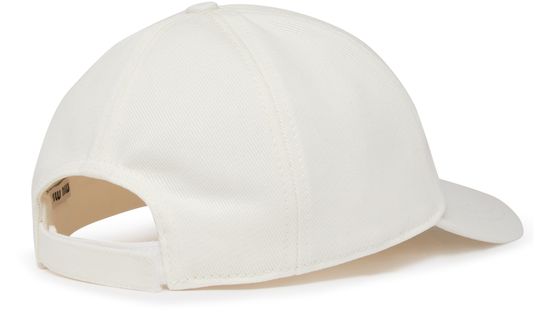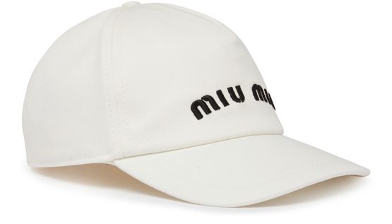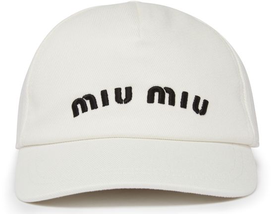 Miu Miu's Cotton baseball cap features an adjustable tab for changing the circumference, visible stitching for added detail, a curved visor for a classic look, and a front logo for a touch of branding. This cap is a stylish and versatile accessory for completing any casual outfit.