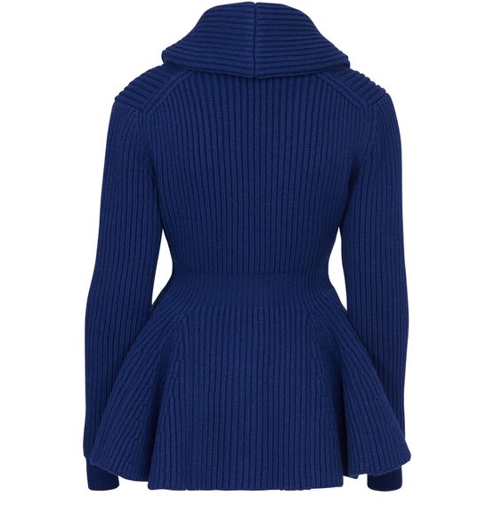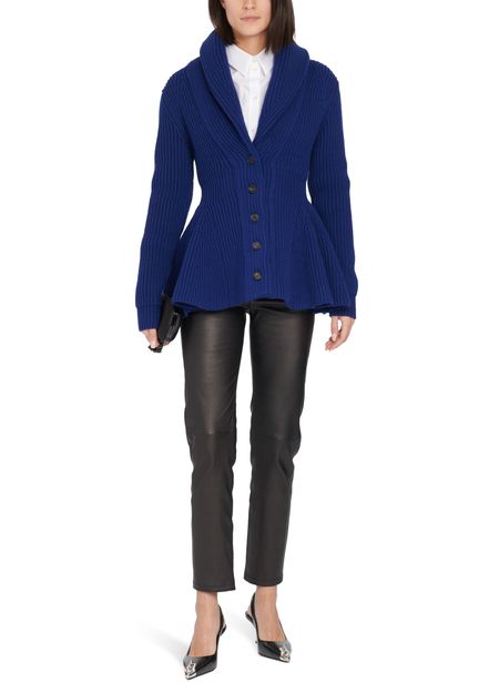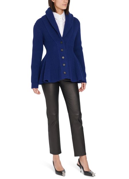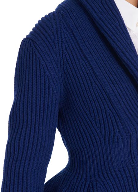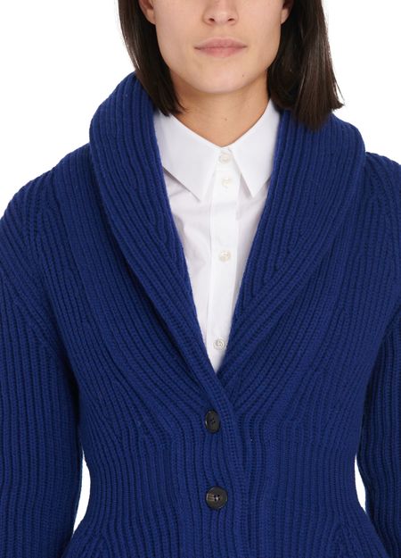 This elegant cardigan is a signature piece by Alexander McQueen. This button-front piece has a wonderful wide fit and a shawl collar surrounding a bold neckline.