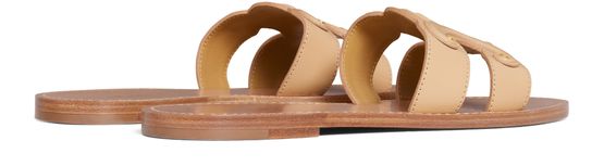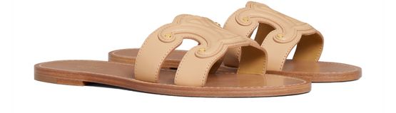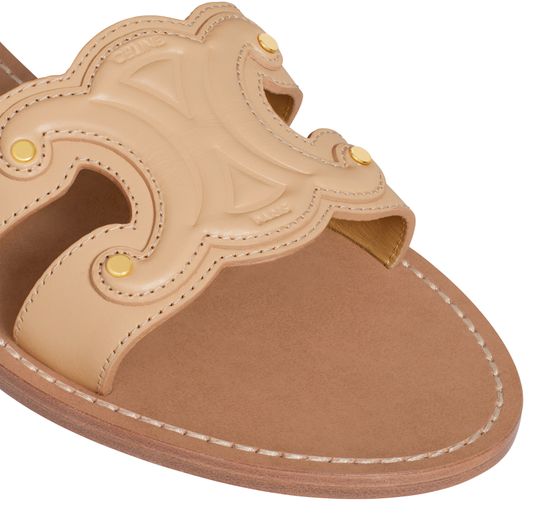Celine Triomphe calfskin sandals embody effortless elegance with their round toe shape and triomphe signature leather patch. The stacked leather heel with a rubber top lift provides comfort, while the leather insole features intricate stitching details. Crafted with franciscan construction, these sandals promise durability and style for any occasion.