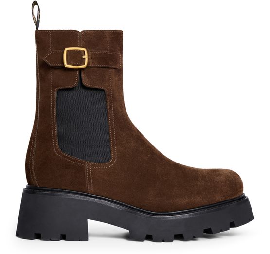 Step into elegance with Celine's Triomphe rangers Chelsea boot. Crafted from luxurious suede calfskin, this slip-on design features an ungraved buckle and a Triomphe twill pull tab for effortless style. Elastic sides ensure a snug fit, while the leather insole and rubber outsole with leather welt promise comfort. Made in Italy, this model is true to size, inviting you to embrace sophistication with every step.