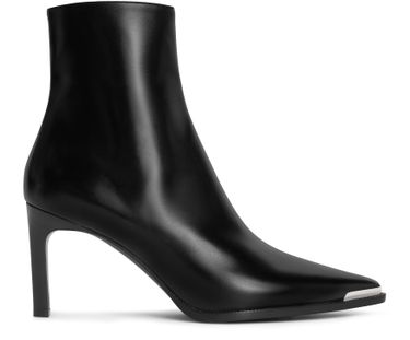 Celine verneuil calfskin ankle boots embody modern elegance with their pointed toe shape and smooth metal toe cap seamlessly integrated between the upper and outsole. The straight heel offers a refined silhouette, while the inner side zip ensures effortless wear. With a leather insole and outsole, these boots promise comfort and style.