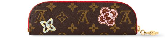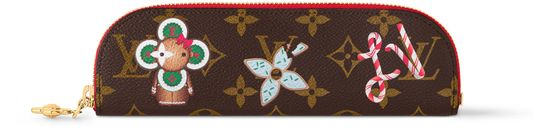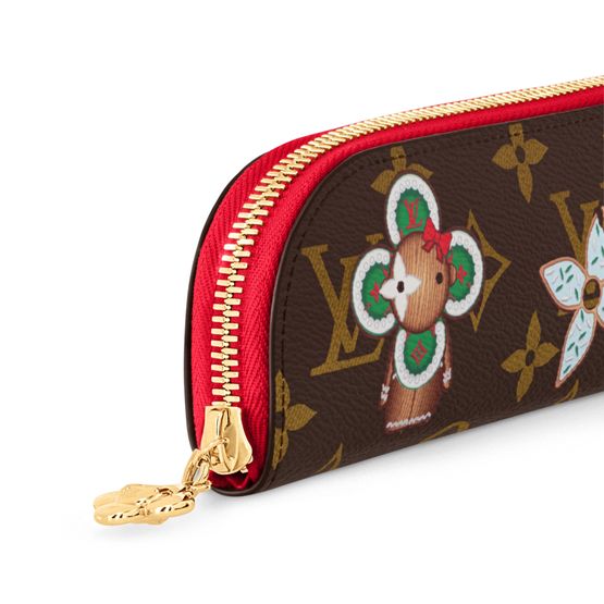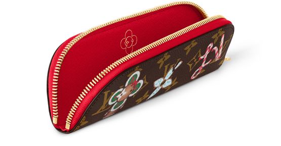 This version of the Charlotte pencil pouch lends a festive spirit to everyday tasks. The zip-up flat case protects writing instruments and slips easily into a bag. This style from the Candy Factory capsule is covered in prints of Vivienne, in holiday-ready attire, and cookies and other sweets. The pouch zips open to reveal a rich red leather interior.