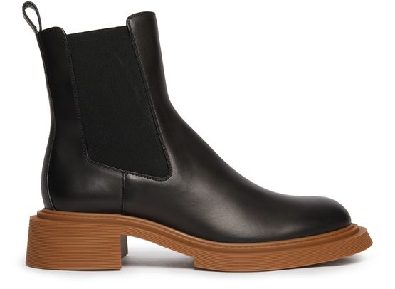 The Loewe Chelsea boots exude timeless elegance with their smooth leather construction. Featuring a contrasting sole and a square heel, these boots offer a modern twist to a classic design. The elasticated sides and back loop ensure easy slipping on and off, while the pull-on design adds convenience.