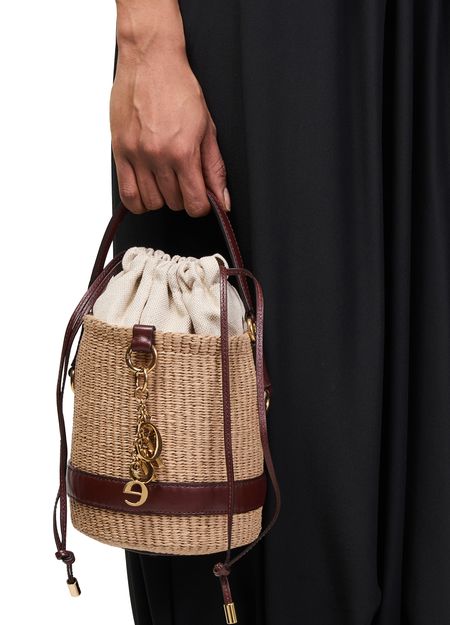 • Description : Bucket bag, gold-tone charms hung by a small chain, single handle, leather handle, carry handle, thin strap, adjustable strap, drawstring closure, interior pocket, fabric.