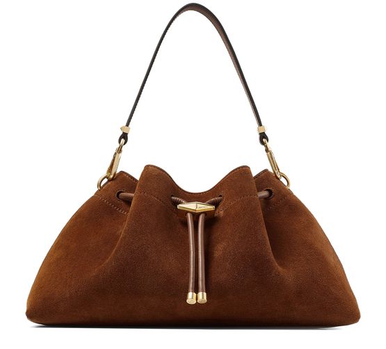 Jimmy Choo's Cinch M bucket bag combines elegance and practicality. Its fine bandoulière allows for a porté épaule style, while the unique compartment and sliding cord closure provide easy access. With golden finishes, a metallic logo at the front, and visible stitching, this bag is a statement piece for any occasion.