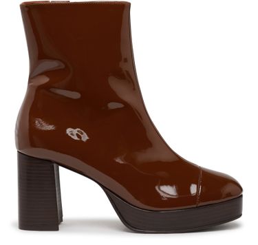 • Description : Patent leather, round toe, lined, high-top upper, side zipper, engraved logo, thick outer sole, block heel.