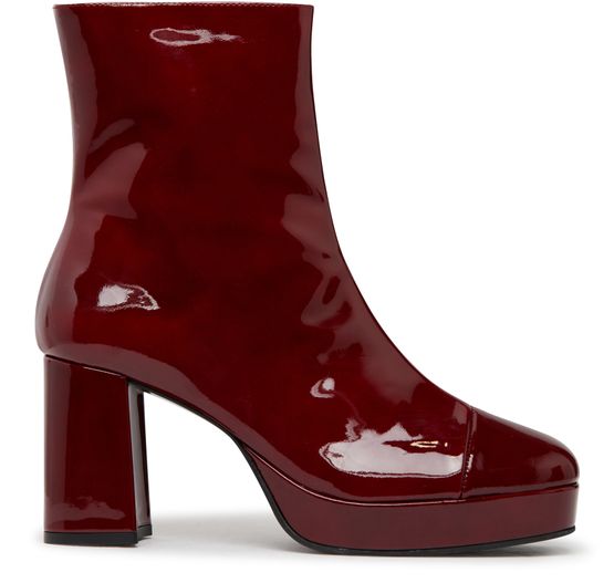 Carel's Club Ankle boots are made from patent leather and feature a round toe design. They are lined for added comfort and have a high-top upper with a side zipper for easy wear. The boots also have an engraved logo, a thick outer sole, and a block heel for a stylish and sturdy look.
