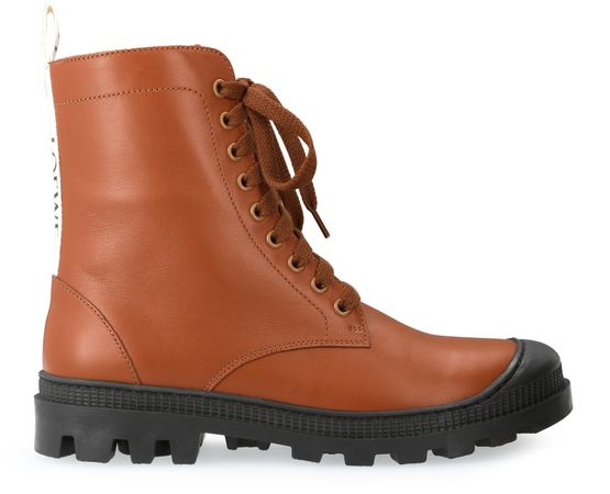 These combat ankle boots combine a thick notched sole with a leather lining and high lacing. Loewe has designed these shoes with a contrasting band on the back of the foot.