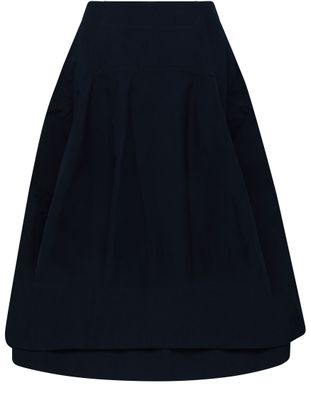 This pleated skirt from Bottega Veneta features a flared cut and an oversized shape for a modern, yet sophisticated look. The midi length and high-waisted fit add a touch of elegance to this versatile piece. Perfect for any occasion, this cotton skirt is a timeless addition to any wardrobe.