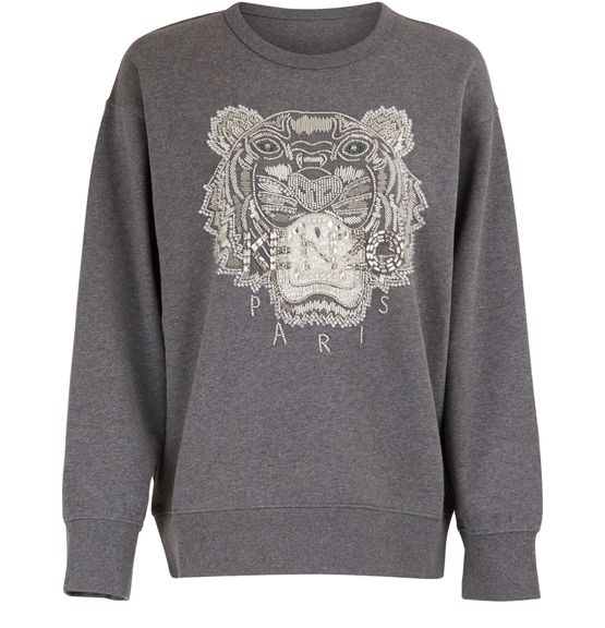 This tiger cotton sweatshirt revisits one of the Franco-Japanese fashion house Kenzo's iconic designs. The plainly colored tiger evokes a retro style while beads add a feminine touch to the piece. Emphasize contrasts by pairing the model with a miniskirt or tone-on-tone pants and pearl earrings for a sleek look.