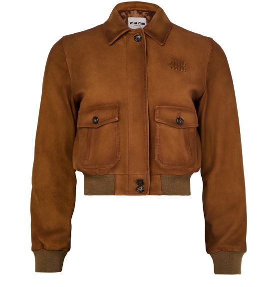 Reimagine Miu Miu's crop suede aviator jacket. This regular fit bomber jacket features a sophisticated button fastening and long sleeves, ensuring a stylish silhouette. Crafted with an embroidered chest logo and flap pockets, it's a versatile piece that transitions seamlessly from casual to formal occasions.