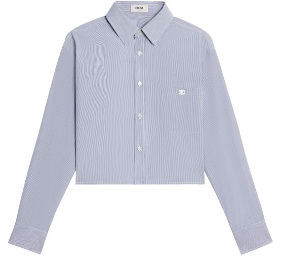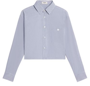 Celine's Cropped shirt showcases a loose fit that effortlessly combines elegance and comfort. Its drugstore collar frames the face beautifully, while the Triomphe embroidery adds a touch of sophistication. A single patch pocket on the chest and buttoned cuffs, adorned with mother-of-pearl buttons, complete this Italian-made masterpiece, perfect for any occasion.