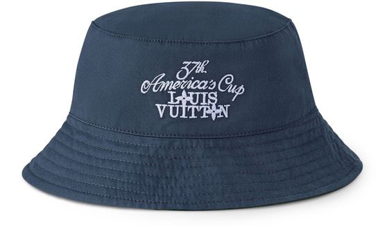 Perfect for sunny days by the sea, the Damier Flags Reversible Bucket Hat stands out with its tricolor tones inspired by the Louis Vuitton 37th America’s Cup. The bold graphic motif enriched with Monogram and Damier elements can be reversed to reveal a navy blue side, adorned with an embroidered Louis Vuitton America’s Cup logo in contrasting white.