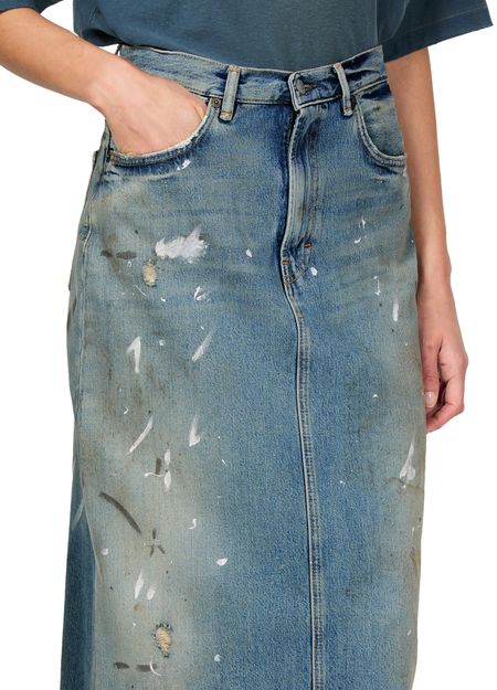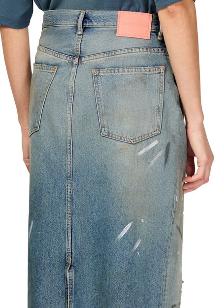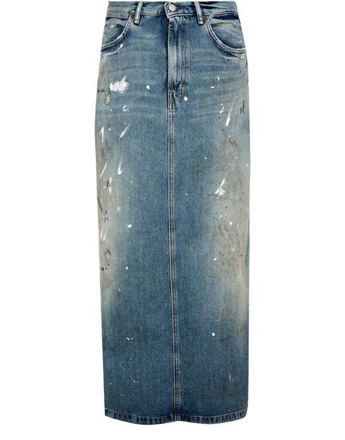 Discover Acne Studios Denim long skirt. This maxi-length skirt features a faded effect, enhancing its modern allure. Detailed with a buttoned zipper closure, back patch pocket, and two front pockets, it offers both style and functionality. The visible stitching and back slit add a contemporary touch, while belt loops ensure a perfect fit.