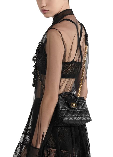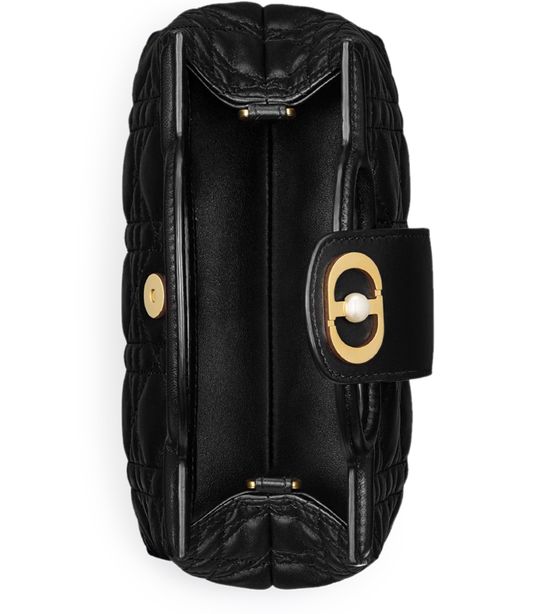 Description : Main composition: lambskin, lambskin lining, magnetic flap closure with CD clasp and resin pearl on the front, one compartment, leather double top handle, adjustable and removable chain with resin pearls and leather inse.