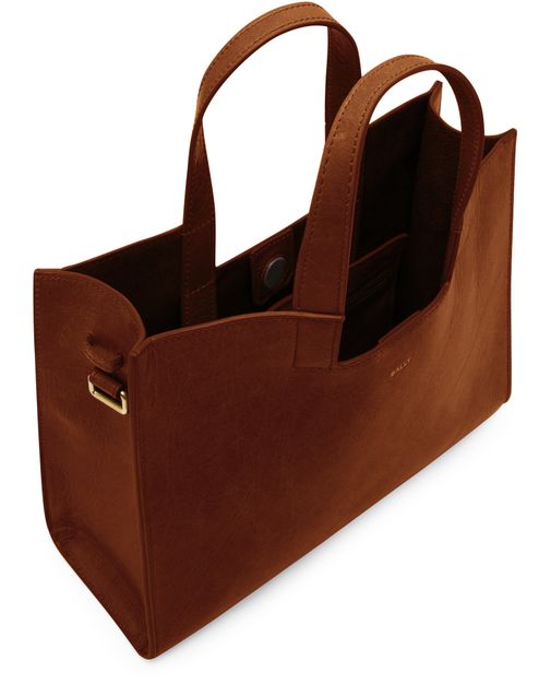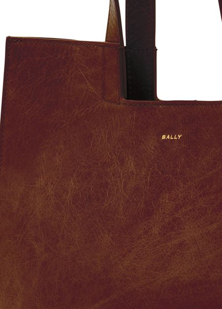 Reveal Bally's tote, a statement piece defined by double handles and a thin, adjustable strap for versatile wear. The front logo in gold letters and visible topstitching showcase refined craftsmanship, while the structured silhouette ensures both style and practicality for your everyday essentials.
