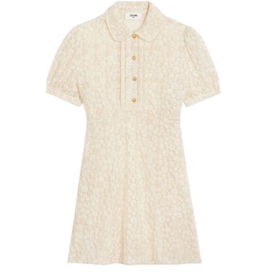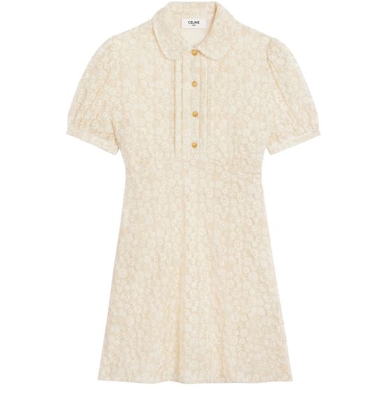 Celine's Embroidered babydoll mini dress in tulle is a whimsical piece that captures the essence of femininity. Adorned with all-over floral and Triomphe embroidery, it features a classic fit, a charming claudine collar, and playful short balloon sleeves. The pleated front panel and elegant side zip add a touch of sophistication, making it a delightful choice for any occasion.