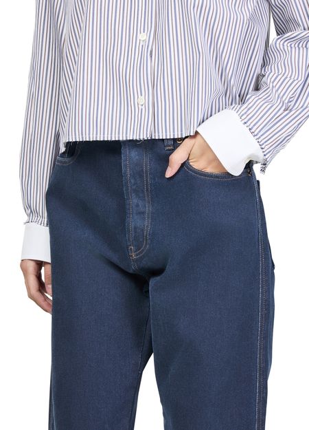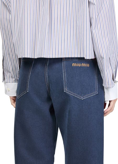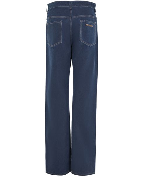 Unveil Miu Miu's flocked jeans featuring a chic buttoned zipper closure and ankle length for contemporary flair. Crafted from premium denim, this piece offers two front pockets and a back patch pocket for utility, while visible stitching and belt loops add to its allure.