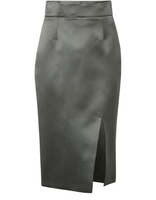 This mini-skirt in cotton gabardine with moire accents, which bears the Miu Miu signature, accentuates a feminine look with an elegant slit that reveals an inch or so above the knee.
