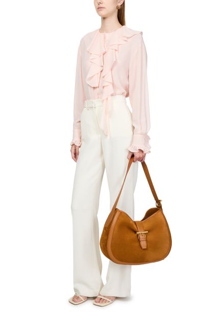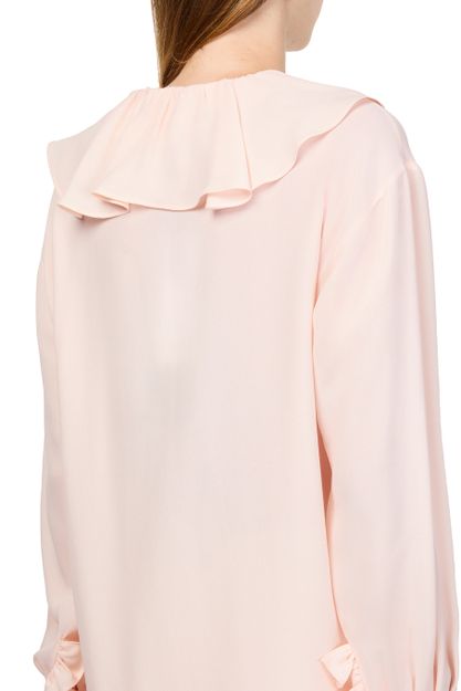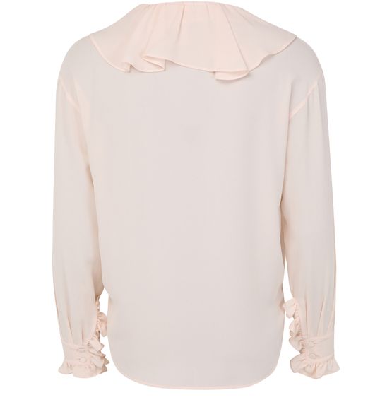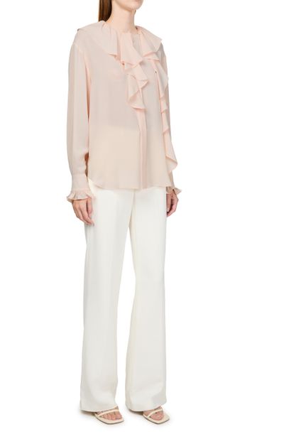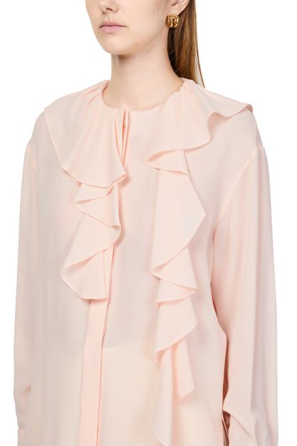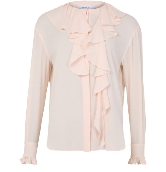 Unveil Alexander McQueen's Georgette shirt, a masterpiece of elegance with its loose fit and ruffled sleeves. The concealed closure enhances the sleek silhouette, making it a versatile addition to any wardrobe. Perfect for elevating both day and evening ensembles.