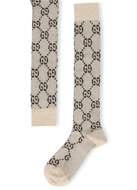 With a confidently vintage style that features subtle, discreet gridlines in the background, these high socks proudly display prestigious fashion house Gucci's signature GG.