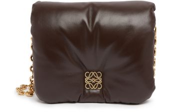 The Loewe Goya Puffer quilted bag is a stylish mini bag crafted from smooth leather. It features a chain strap for versatile wear, allowing it to be worn on the shoulder or crossbody. The bag showcases the brand's logo on the front, adding a touch of sophistication to any outfit.