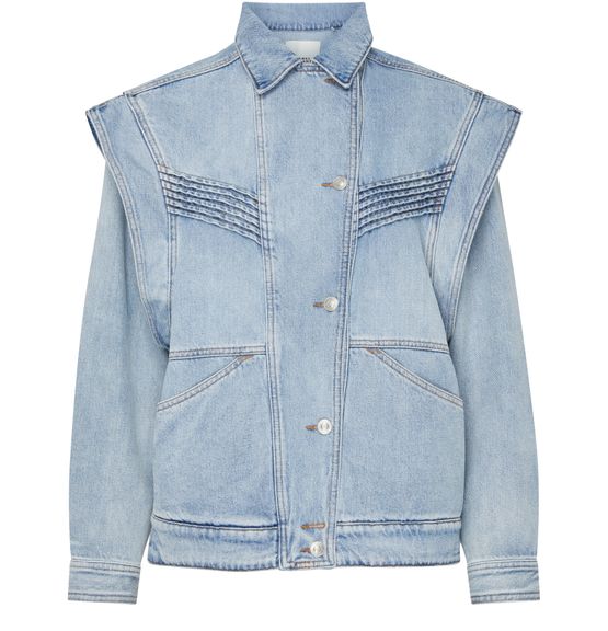 Isabel Marant's Harmon denim jacket features a long-sleeved design with a front buttoned closure. It is adorned with a logo at the back and a logo at the back label, adding a touch of brand recognition. This stylish jacket also includes practical side pockets for added functionality.