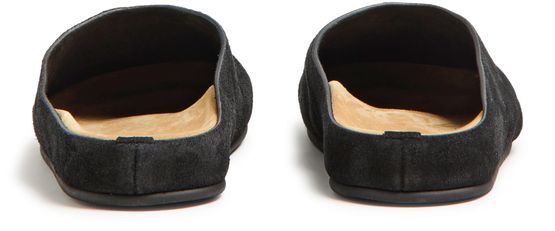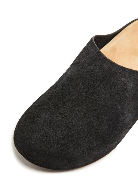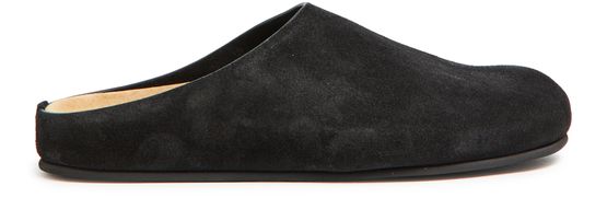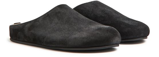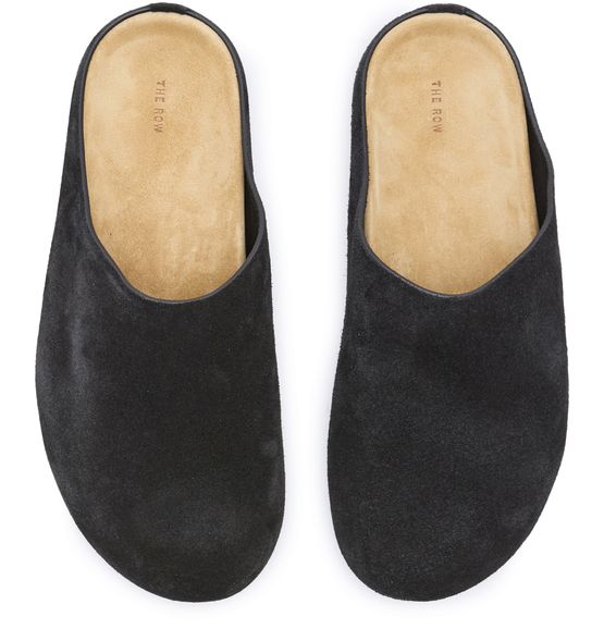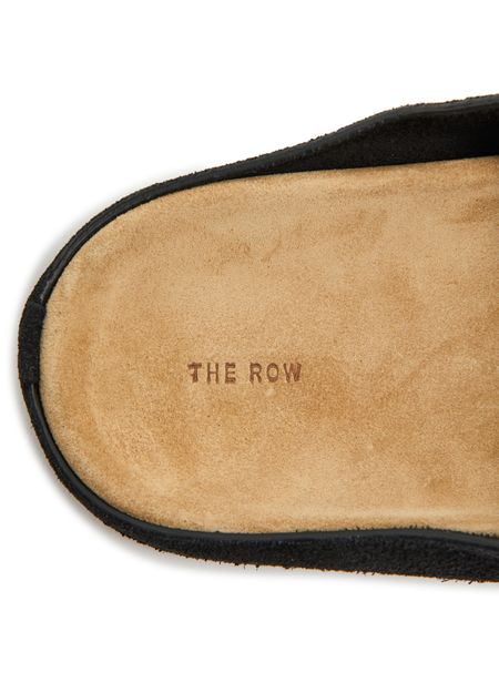 The Row's Hugo slides showcase a sleek flat design with a round toe, perfect for effortless style. Visible stitching adds a refined touch, while the engraved logo enhances its elegance. The logo-printed insole ensures comfort, making these sandals a versatile choice for any occasion, blending luxury with everyday wear.