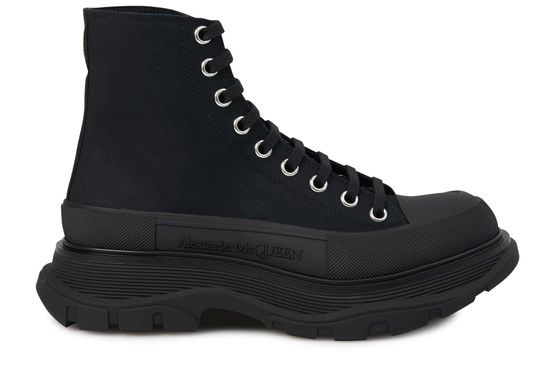 Alexander McQueen's Hybrid ankle boots are designed for women. Their strong lines are reinforced by the sole bearing the designer's logo.