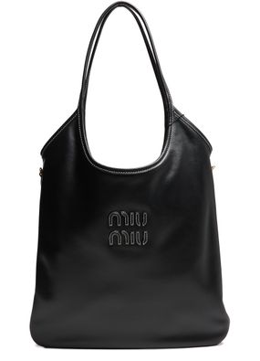Reveal Miu Miu's tote bag, designed with a sleek and smooth leather finish. The elegant contrast stitching highlights craftsmanship, while the metallic "Miu Miu" lettering adds a sophisticated charm. Featuring double handles, a spacious interior, and a zippered pocket, it effortlessly blends style with practicality.