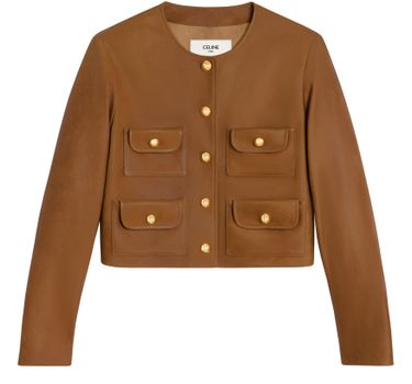 Celine's Jacket with pure collar in patina finish suede embodies timeless elegance and versatility. Its classic fit is accentuated by four rounded patch pockets with flap, while five half-sphere Triomphe snap buttons add a distinctive flair. Crafted in Italy, this jacket is a statement piece for the modern wardrobe.
