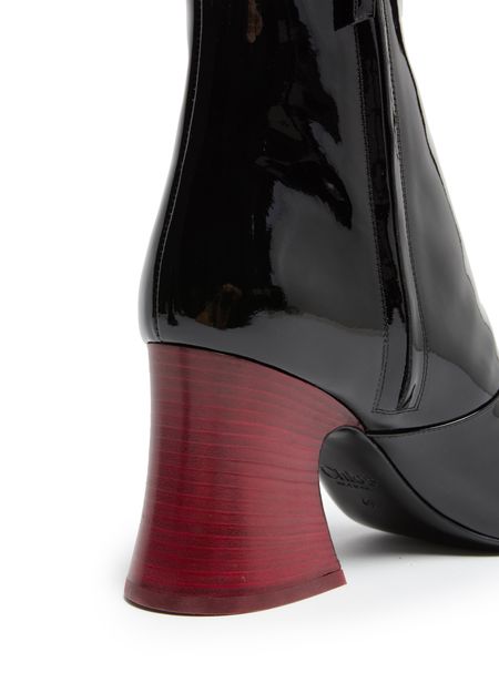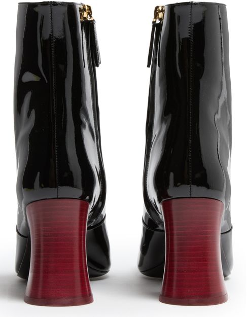 Discover Chloe's Janis ankle boots, crafted from luxurious patent leather. These high-heeled boots feature a block heel and a sophisticated square toe, accented with a zippered closure. The logo in gold letters and logo-printed insole add a touch of elegance, making them a standout choice.