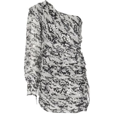 • Description : Draped dress, all-over print, mini length, long puff sleeve, fitted asymmetric cut.