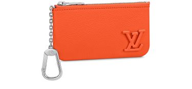 Louis Vuitton’s compact, practical Key Pouch now comes in an eye-grabbing shade of lustrous orange. Supple Aerogram leather is adorned with the “LV” monogram in tone-on-tone metal. Great for carrying coins and cards as well as keys, it features a chain and hook to clip it onto a larger bag for a splash of color.
