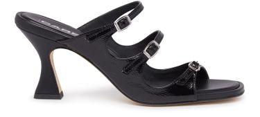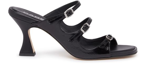 Carel's Kitty sandalestyK is a stylish and elegant option for any occasion. The sandal features a metallic logo on the side and a logo in silver letters, along with a French heel and open square toe for a modern touch. The logo-printed insole and metal finish add a luxurious feel, while the logo buckle strap and high heel complete the sophisticated look.