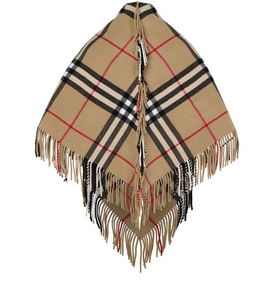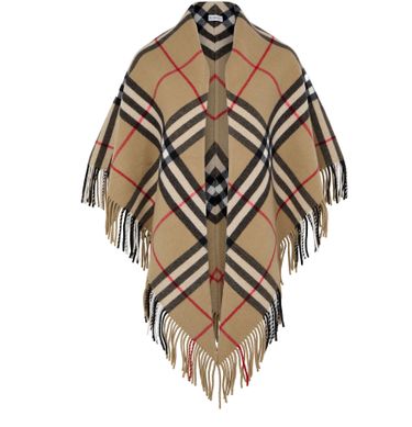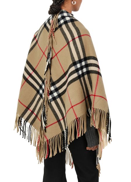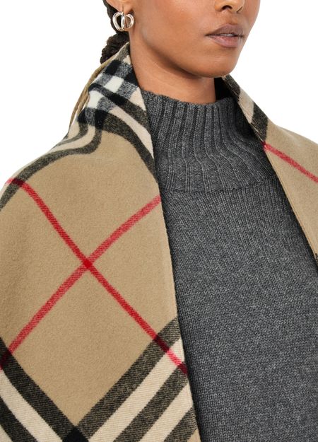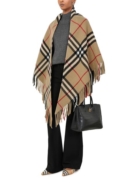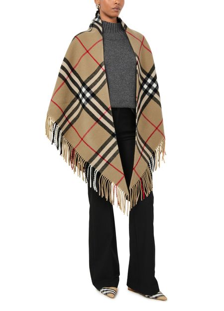 Large checked cape features a timeless checked pattern and fringe details for a classic yet modern look. Its oversized style is perfect for layering over any outfit, and the fringed edges add a touch of texture and movement. This statement piece is versatile and stylish for any occasion.