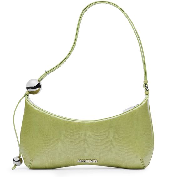 Jacquemus's Le Grand Bisou Perle bag is a chic baguette bag designed for versatility. It features a zipper closure and a single compartment, adorned with a front logo in silver letters. The adjustable thin strap allows it to be hand carried or worn on the shoulder, showcasing exquisite visible topstitching and a sleek silver finish.